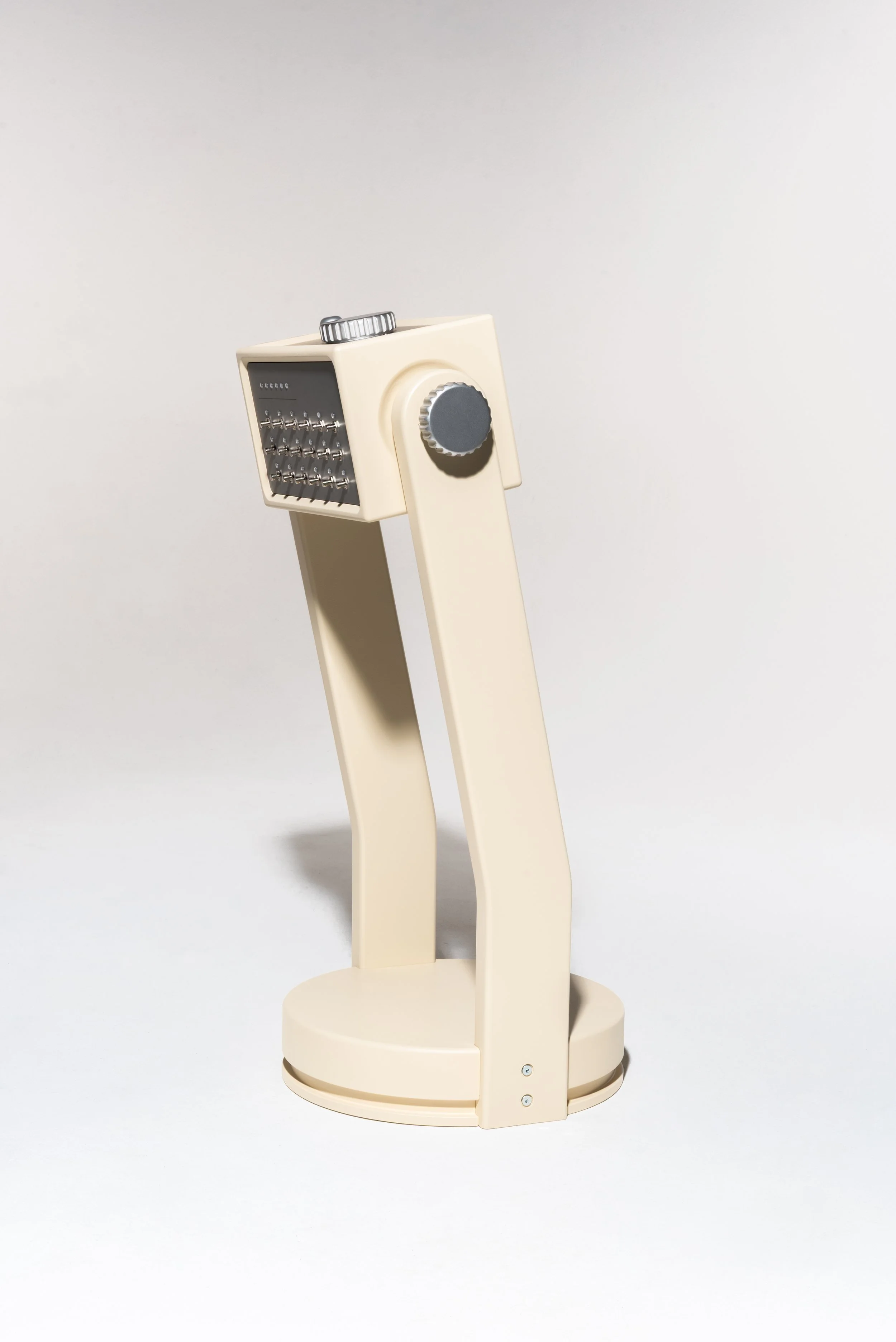 Das zentrale mechanische Element der Konsole besteht aus zwei Beinen, zwischen denen ein Quader gelagert ist, der sich um seine eigene Achse drehen kann. Die Drehbewegung wird geführt und gleichzeitig an vier Rastpunkten klar begrenzt. Diese Rastpunkte sorgen für eine eindeutige haptische Rückmeldung und verhindern unbeabsichtigte Zwischenstellungen. Im linken Bein ist außerdem noch ein Gleitkontakt untergebracht. Der Gleitkontakt ermöglicht es, dass sich die im Inneren des Quaders geführte Elektronik mitdrehen kann, während das Verbindungskabel zum Sockel feststeht und nicht verdrillt wird.