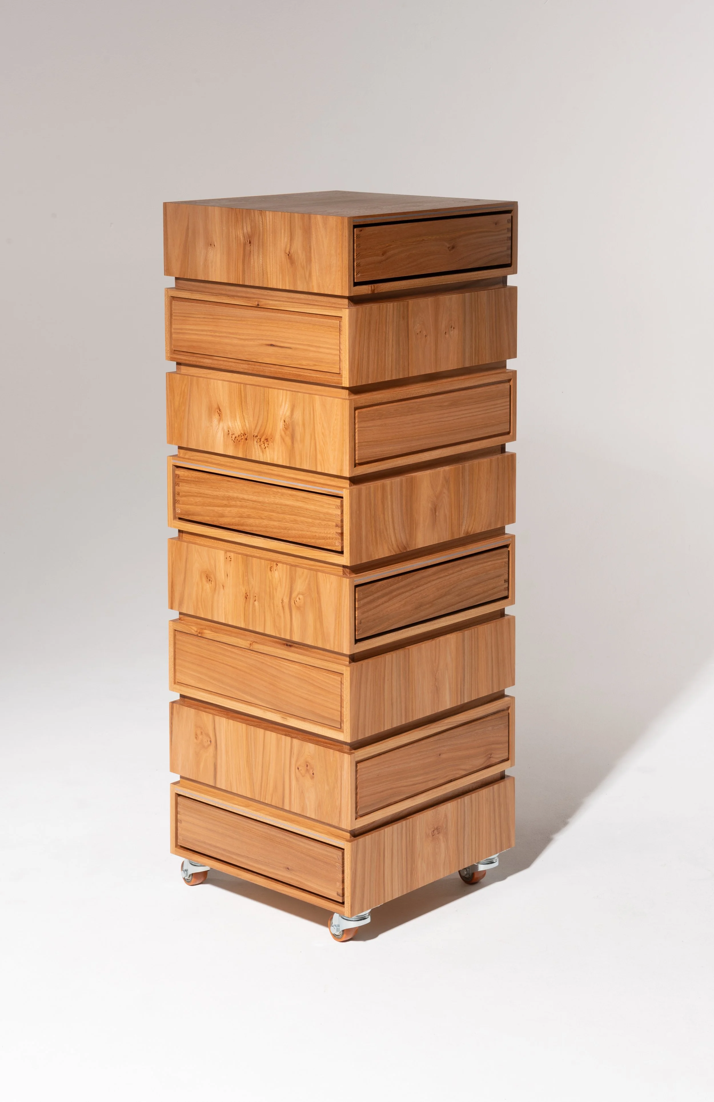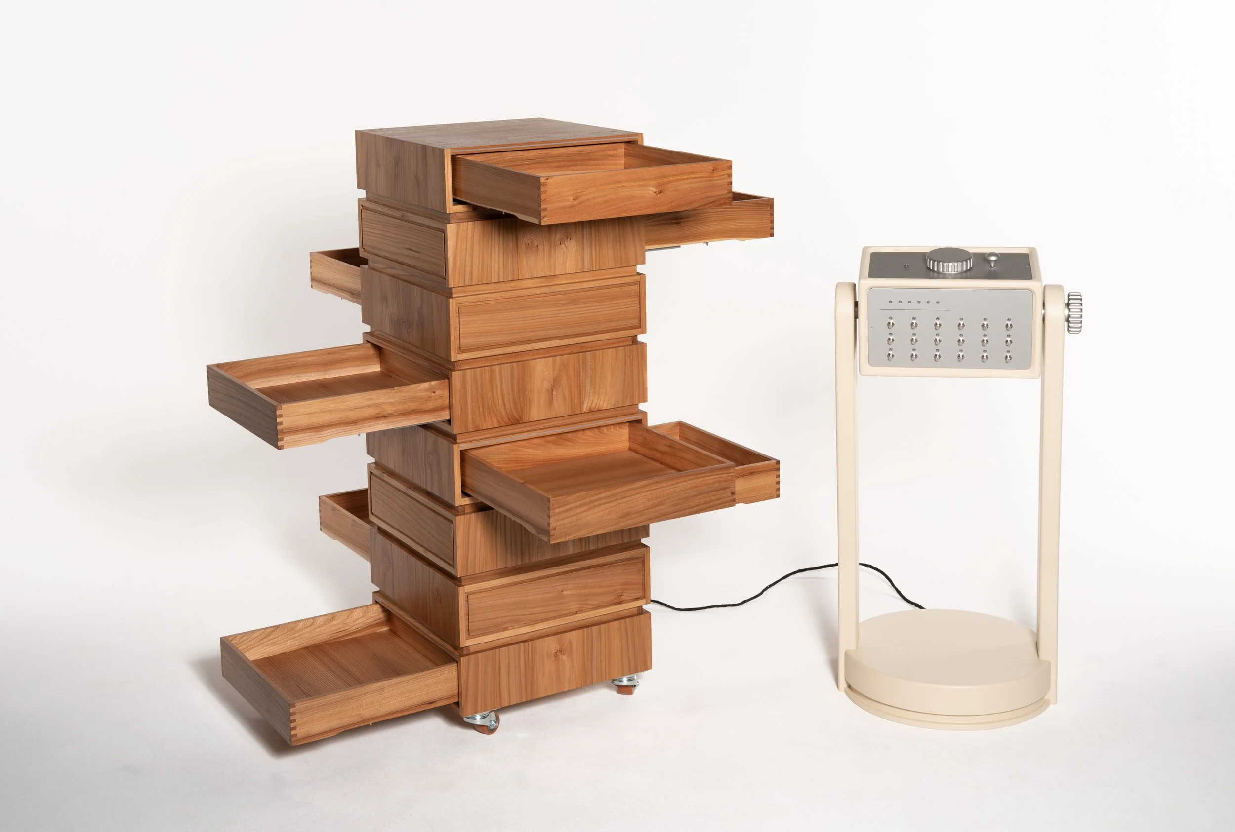 Das Archiv steht auf vier Rollen. Die einzelnen Schubkastenelemente sind jeweils um 90° versetzt übereinandergestapelt, sodass sie sich spiralförmig in alle vier Richtungen öffnen. Das erfordert eine aktive Auseinandersetzung mit dem Möbel, denn um an alle Fächer zu gelangen, muss man entweder um das Archiv herumgehen oder es mithilfe der Rollen drehen.
